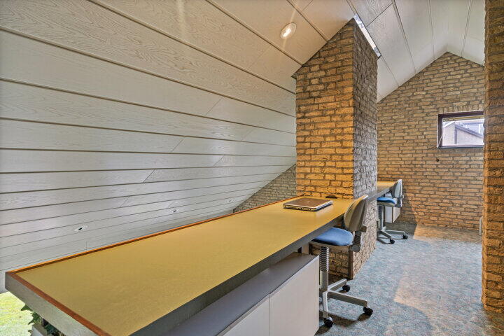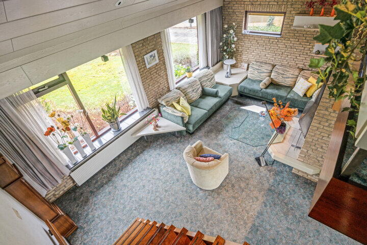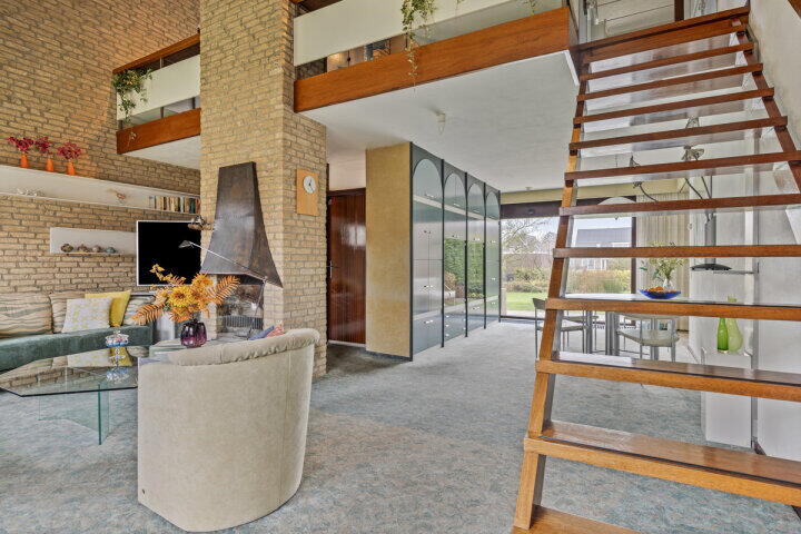 De trap in de woonkamer brengt u naar de eerste verdieping, waar u uitkomt op een ruime vide. Deze lichte plek biedt een prachtig uitzicht over de woonkamer en is ideaal om in te richten als werk- of ontspanningsruimte.