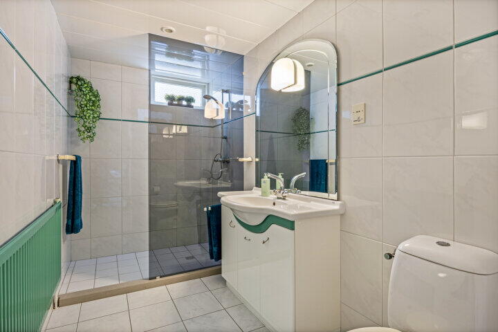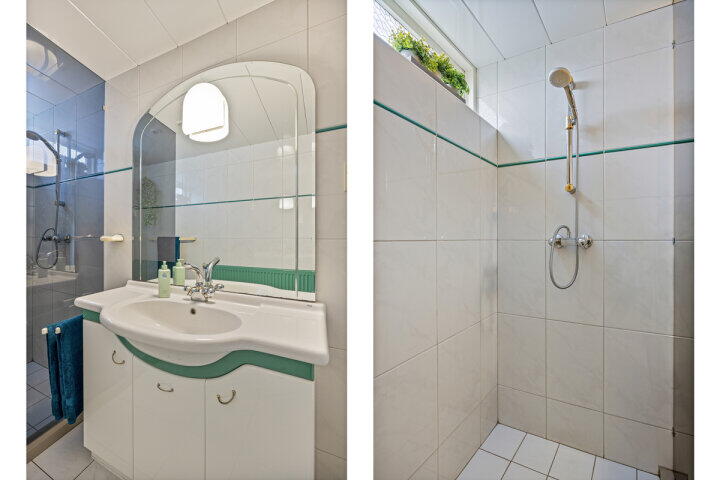 De badkamer is slim ingedeeld en betegeld. Een ruime inloopdouche, wastafel, toilet en radiator zorgen voor comfort en functionaliteit. Hoewel de badkamer direct te gebruiken is, biedt deze ruimte mogelijkheden voor modernisering naar uw eigen smaak.